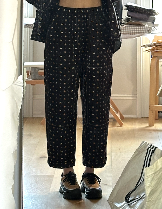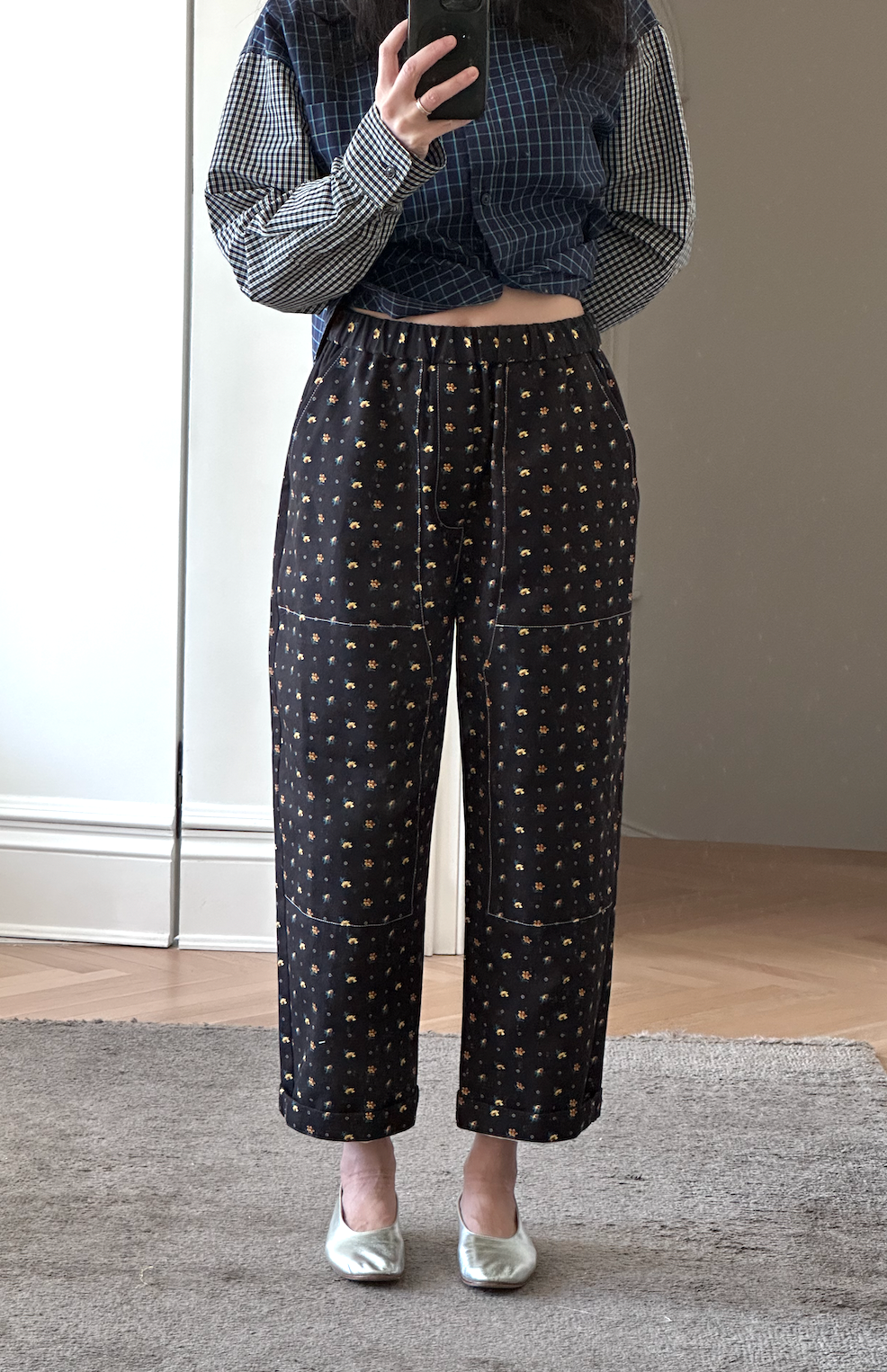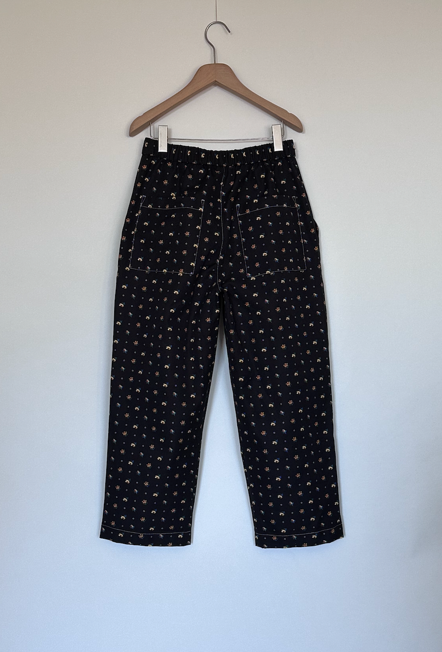 Elastic waistband work pant in a mid weight cotton canvas with a classic Liberty of London paisley print. Oversized fit and sits a bit lower on the waist. If you prefer it to sit higher and not as oversized, go down a size. Two front pockets and 2 patch pockets in the back. 100% cotton woven and printed in Italy. Made in NYC. Kas is wearing Small