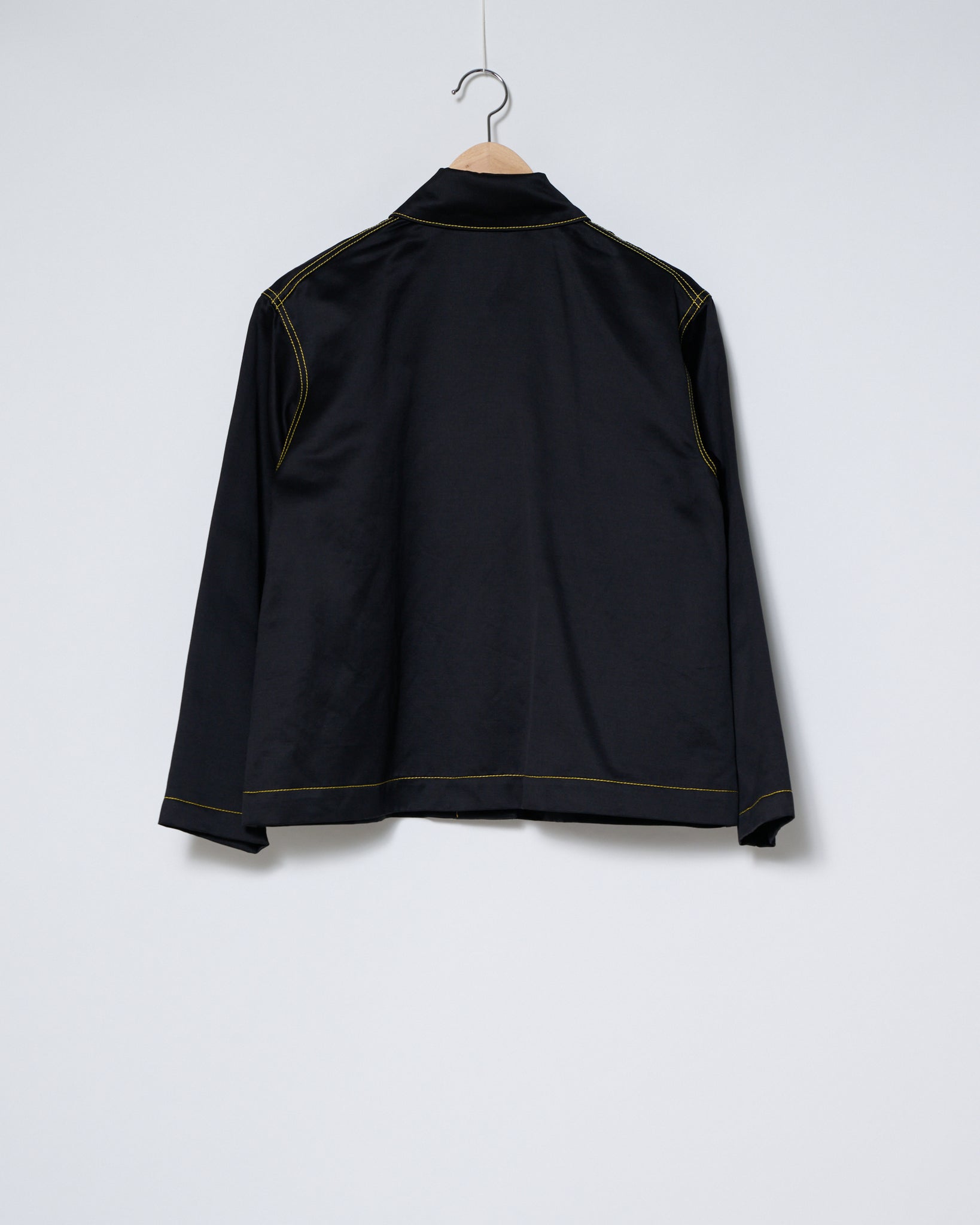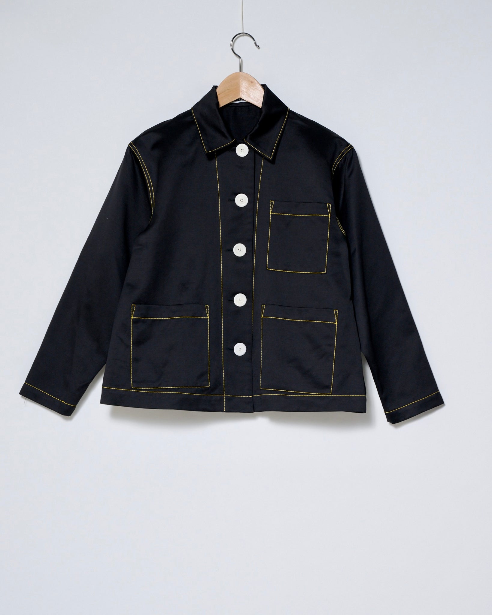 A-line shaped shirt jacket in a cotton linen sateen with yellow top stitching. Large cream corozo buttons from Italy. 70% cotton 30%linen fabric from Italy. This fabric has a nice sheen to it. A little bit dressy but also very casual. Made in NYC, USA