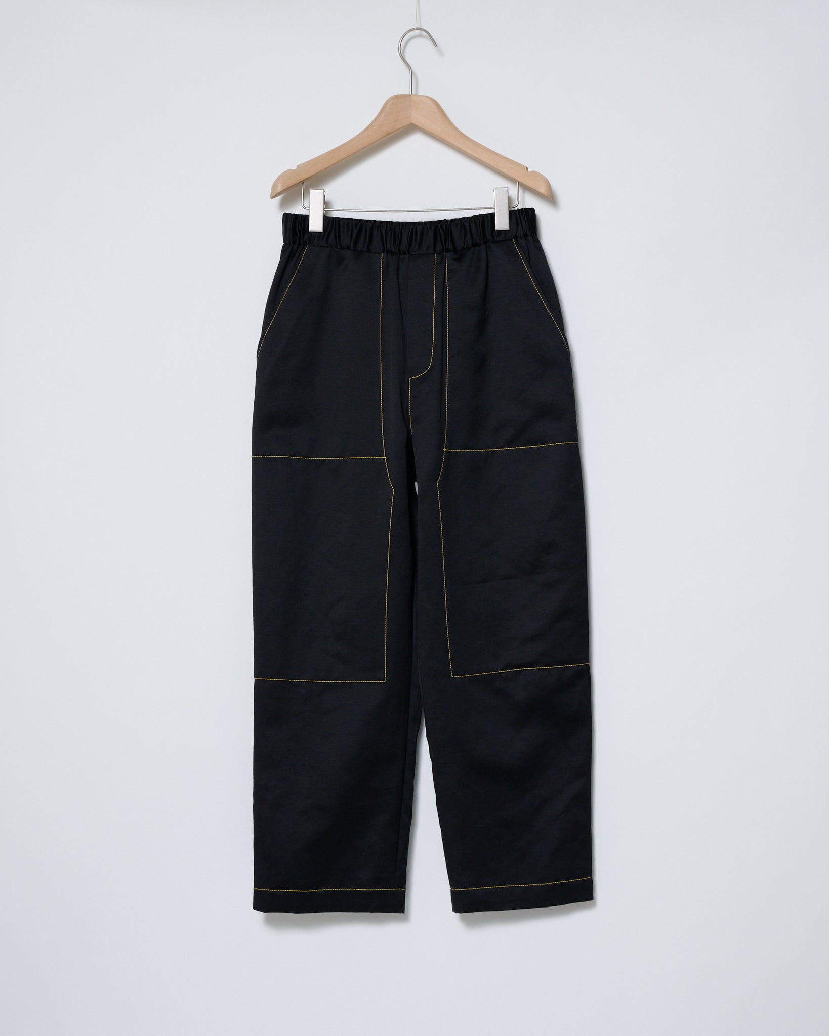 A fun pant inspired by the double knee workpant. These are a pair of loose fitting elastic waist pants in a beautiful black cotton linen sateen from Italy. A perfect way to dress up but feel comfy and casual. 70% cotton 30% linen.