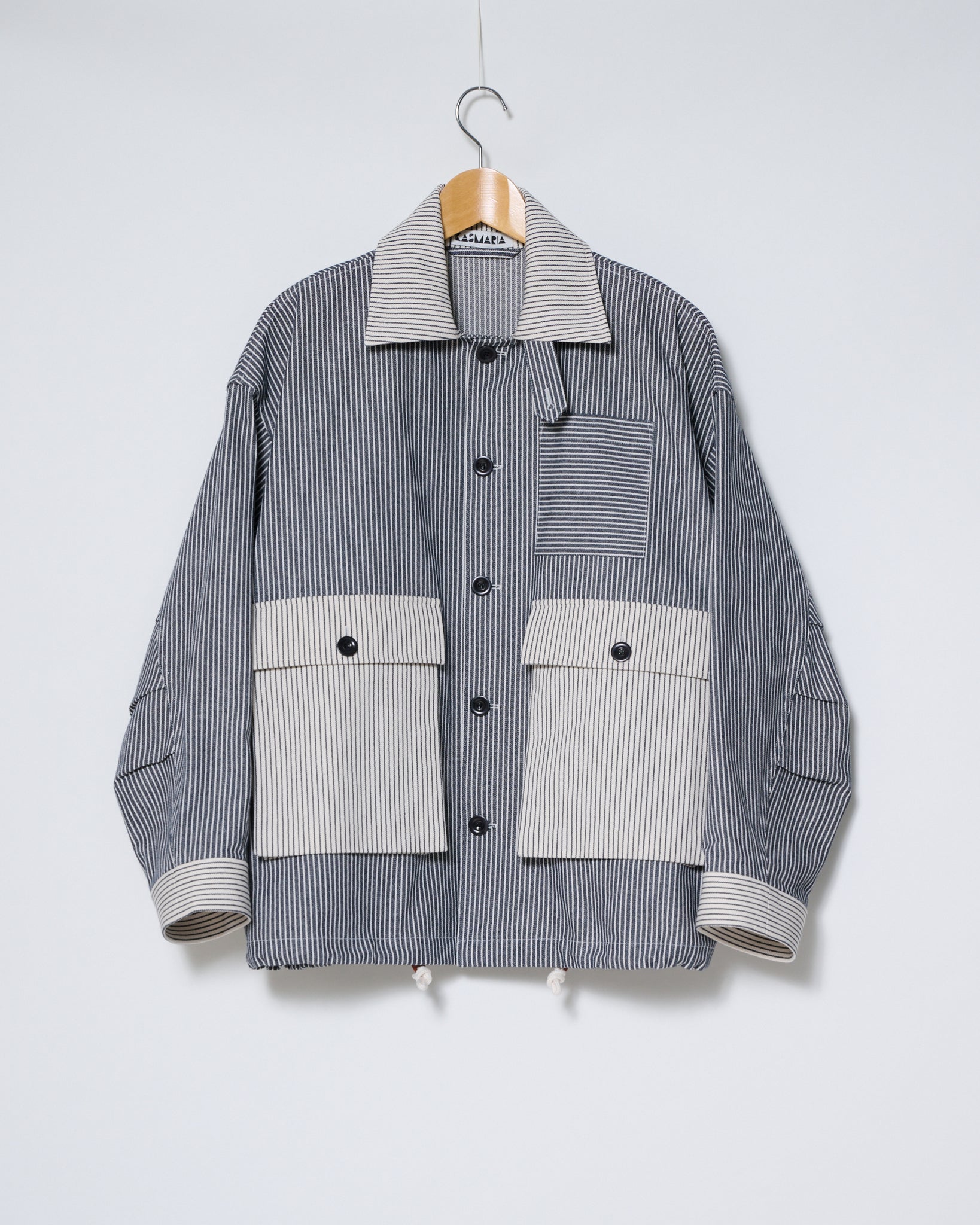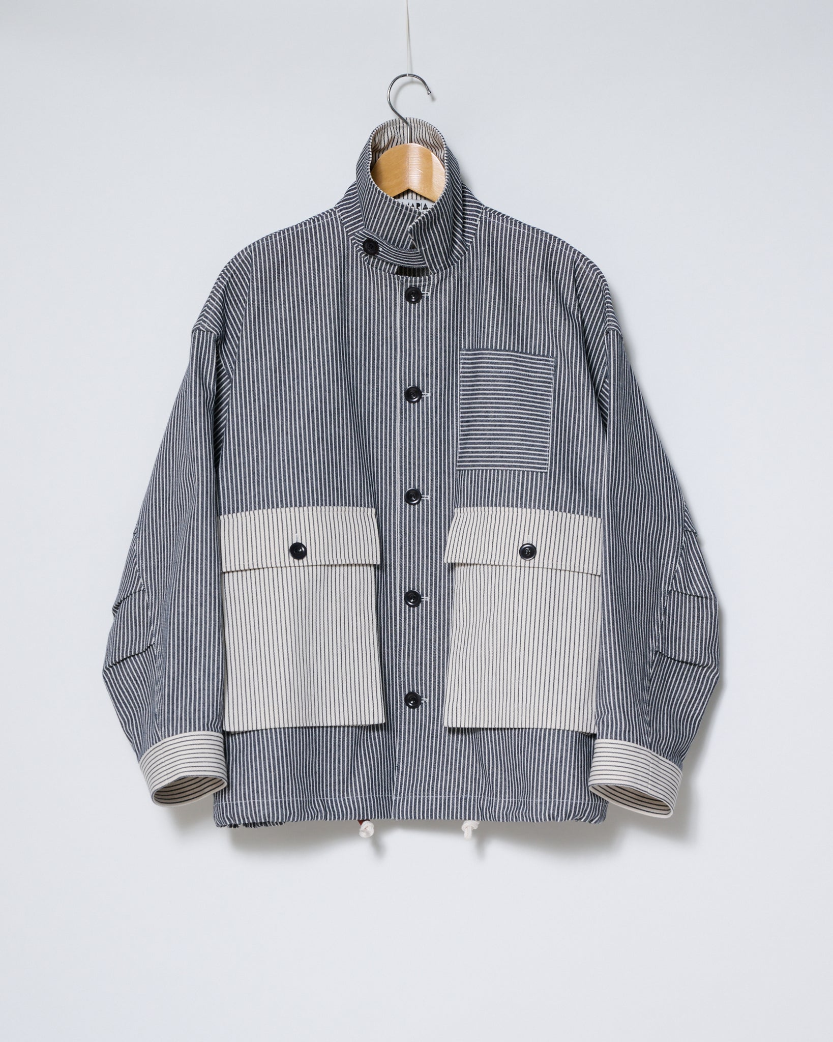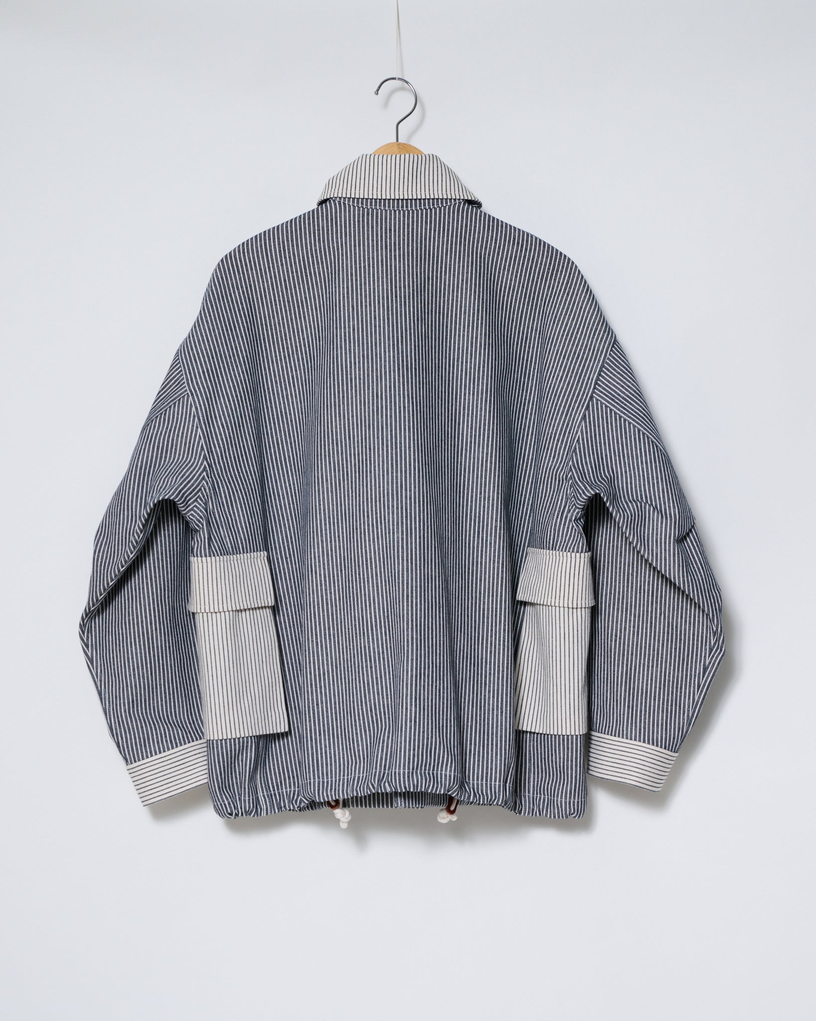 A playful jacket for the season! Made of a combo of cotton twill stripe fabric from Japan. Collar has an extra tab to keep your neck warm. The large front pockets have top and side entry. Cotton cord with leather stopper at hem to cinch (or not). Sleeves have pleats for extra shape. 100% cotton. Made in NYC. Kas is wearing a SMALL.